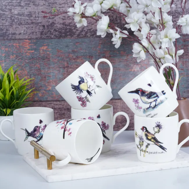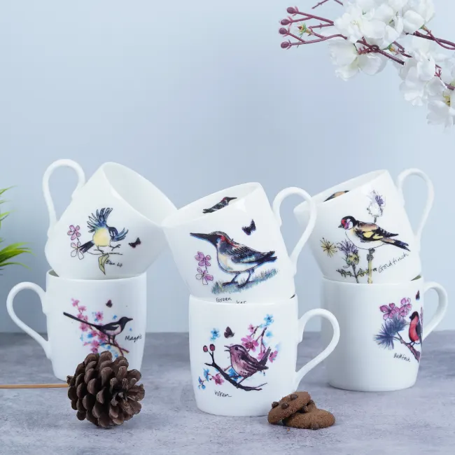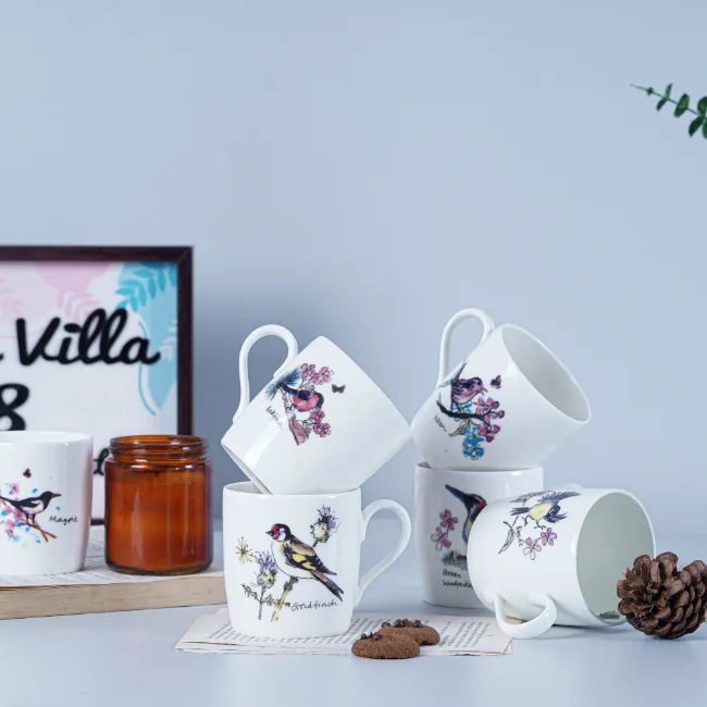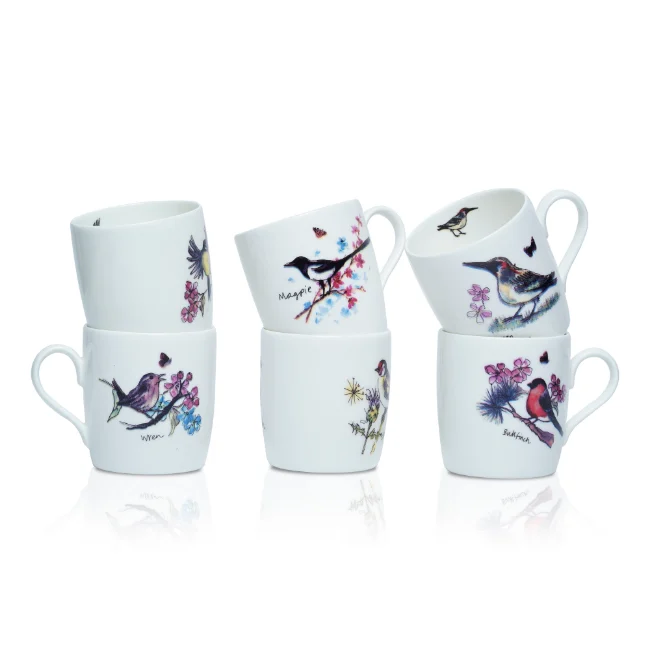 The Ray Birds mug is a delicate dance of nature’s winged wonders. Softly rendered birds flutter across its surface in subtle shades, their graceful flight evoking a sense of freedom and tranquility.